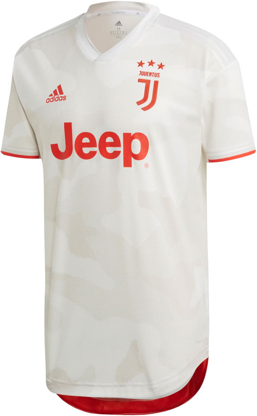 NEWアウェイキットはホワイトを基調とし、全面にカモフラージュ柄をあしらったデザイン。基調色のホワイトは珍しくない色だが、驚きは差し色のレッド。今回のキットはほぼホワイトとレッドの2色で構成されている。これまでのユヴェントスには無かった配色パターンだ。