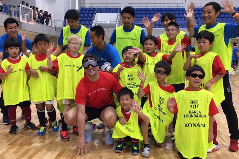 元バルサのジュリアーノ・ベレッチ氏もイベントに参加。視界を遮るゴーグルをつけ、視力障がいを持つ子どもの“リアル”を体験していた。