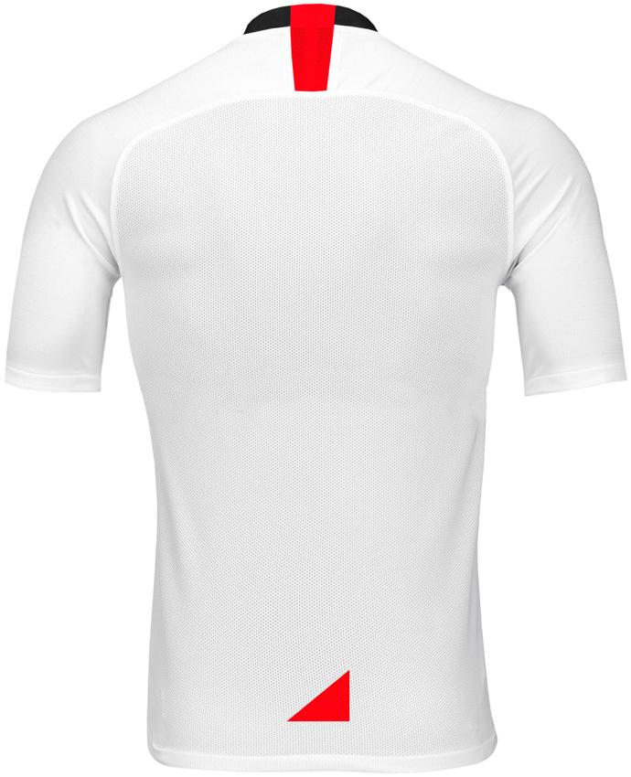 背面もシンプルにホワイト一色に。首元のテープにはチームカラーのレッドを配する。そして目を引くのが腰部分の三角形マークだが、これはクラブの旗を表している。