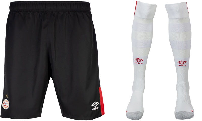 パンツはブラックを基調とした定番デザイン。ソックスはホワイトを基調に、前面にメーカーロゴ、背面にはチーム名“PSV”が入る。