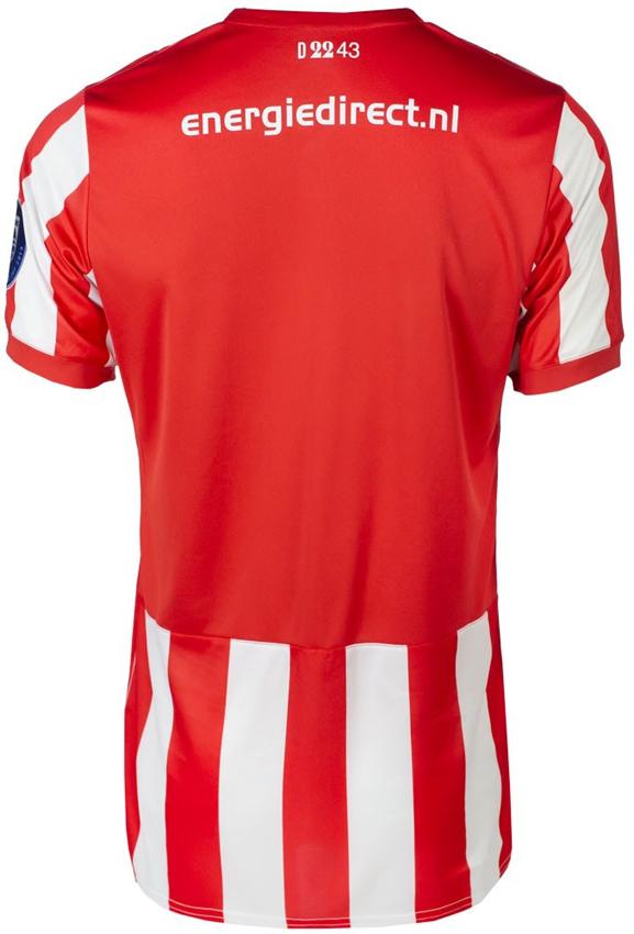 昨季までの胸スポンサー「energiedirect.nl」は、今季より背面へ移動。首元の番号「D 22 43」は、クラブ創設者アントン・フィリップスの息子で、PSVに大きく貢献したフレデリック・フィリップスの座席番号。Dはセクション、22は列、43はシート番号を意味する。
