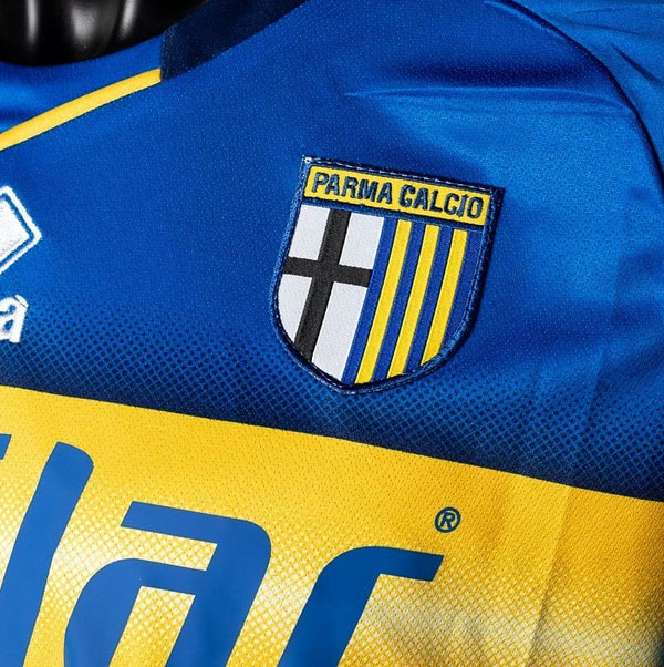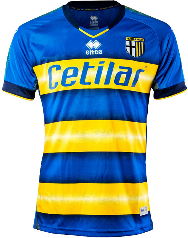 新アウェイユニフォームは、パルマの代表的なデザインであるジャッロブルーの水平ストライプに。胸には消炎鎮痛剤のブランド「Cetilar」のロゴマークを掲出する。