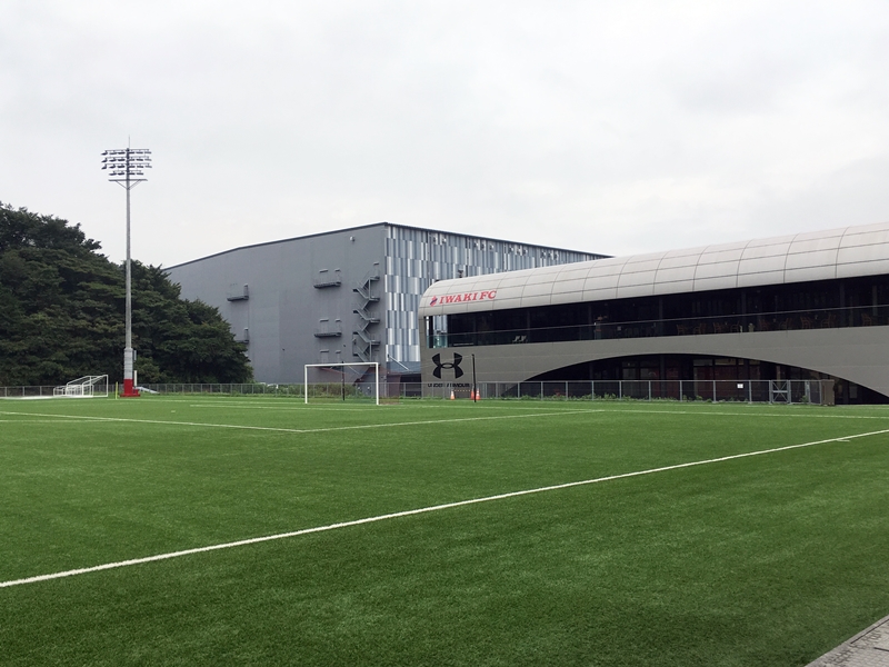 ※クラブハウスの裏にはよく整備された人工芝のグラウンド。奥に見えるグレーの建物がドームの物流倉庫で、クラブハウスも大きいがそれ以上に巨大。