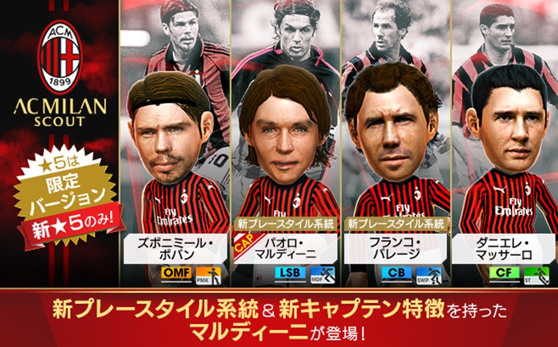 “AC MILAN SCOUT”には、サッカー人生の全てをACミランに捧げ、25年間ミランのバンディエラ(旗手)としてクラブを支え続け、芸術とも言われるディフェンスで史上最高のサイドバックと評された伝説の背番号3「パオロ・マルディーニ選手」と、ACミランの黄金期を支え、その後も途方も無いクラブ愛で2部に落ちたACミランを世界の頂点にまで押し上げ、長年背負った背番号「6」を永久欠番として、キャプテンとしての功績を讃えられている天才DF「フランコ・バレージ選手」が新プレースタイル系統を持つ限定バージョンの新★5選手として登場します。