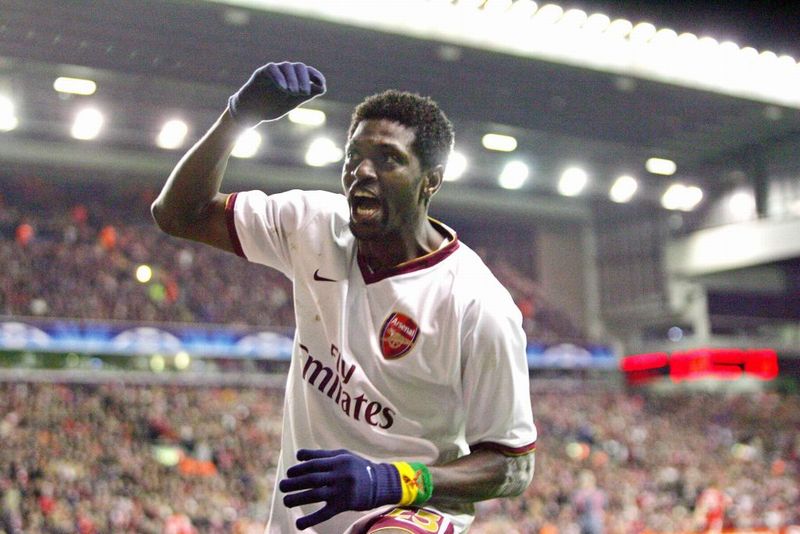 アーセナルで活躍した時期は短かったがインパクトがあまりにも大きかったアデバヨール。このあとマンチェスター・シティにユニフォームを着て古巣ファンの前に膝滑りをすることになるとは、誰も予想していなかった。
