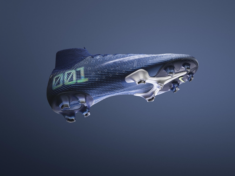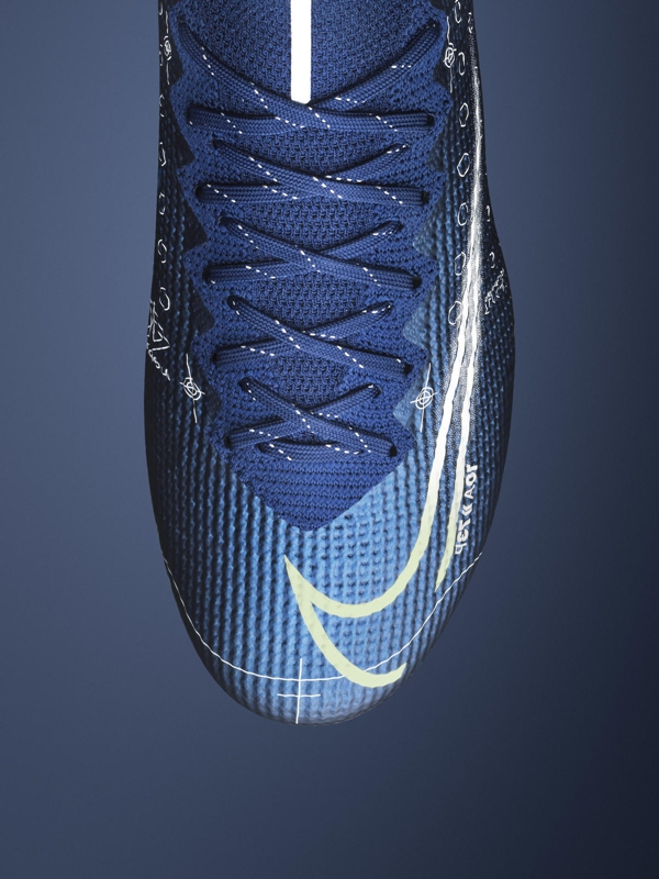 スパイクには、小さい穴のパターン、フライニットのマーク、素材が切り替わる線、色の識別コード、物差し、その他のグラフィック要素など、マーキュリアルの設計図で使われた技術的な詳細が描かれ、スパイクがどのように作られているかを紹介している。