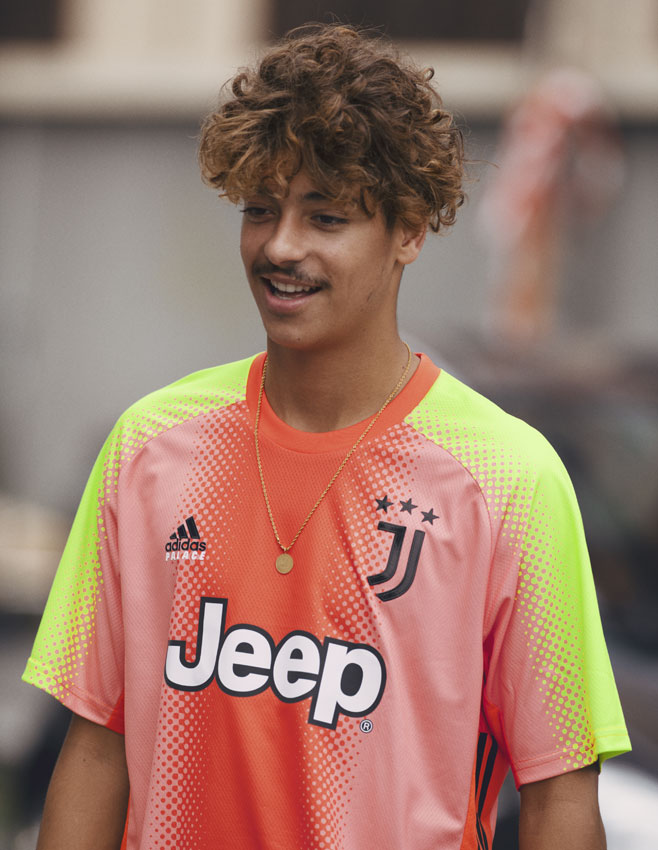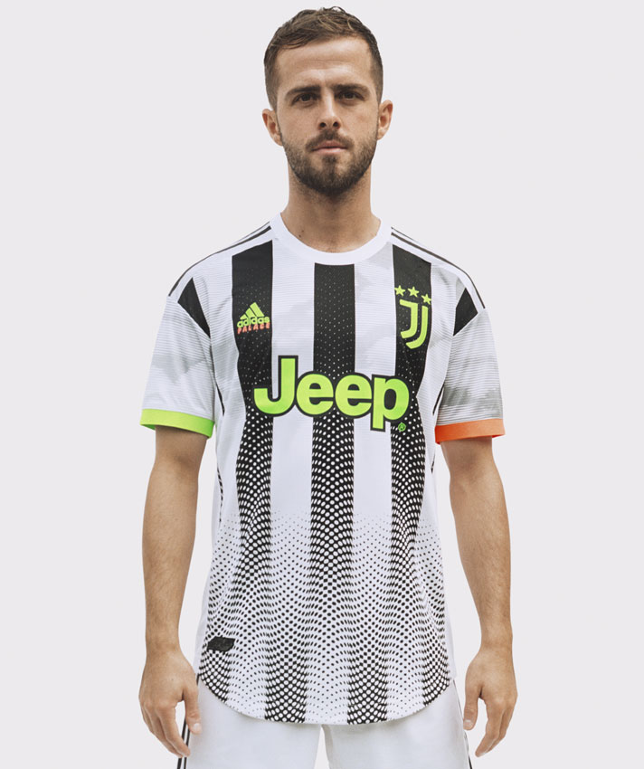 ロンドンのブランドであるパレスは、adidasとのコラボレーションで革新的なユニフォームを制作。ホワイトとブラックの伝統カラーを使用する一方で、袖は斬新なオレンジとグリーンのネオンカラーで彩る。胸スポンサー「Jeep」のロゴや、背面のネームナンバーもグリーンで表現し、鮮烈な一着に。