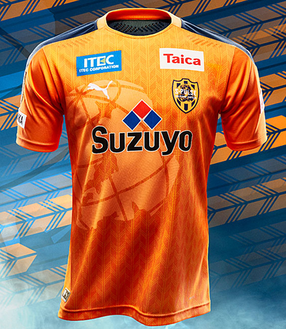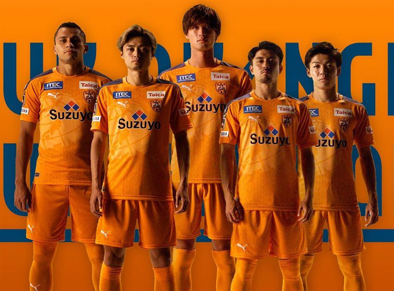 新しいホームユニフォームのデザインは、ホームタウンの静岡市に構える駿府城で徳川家康が行なっていた鷹狩りから着想を得たという。シャツ全体を覆う幾何学模様は、その鷹狩りの際に使用した矢羽をパターン化したものだ。