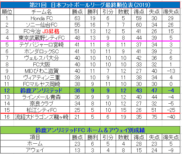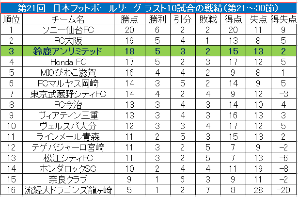 ※得点がリーグで4番目に多く、失点も3番目に多い鈴鹿。ホームとアウェイでの成績の違いも気になるところ。