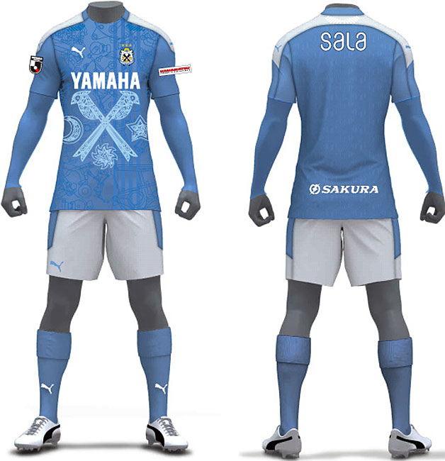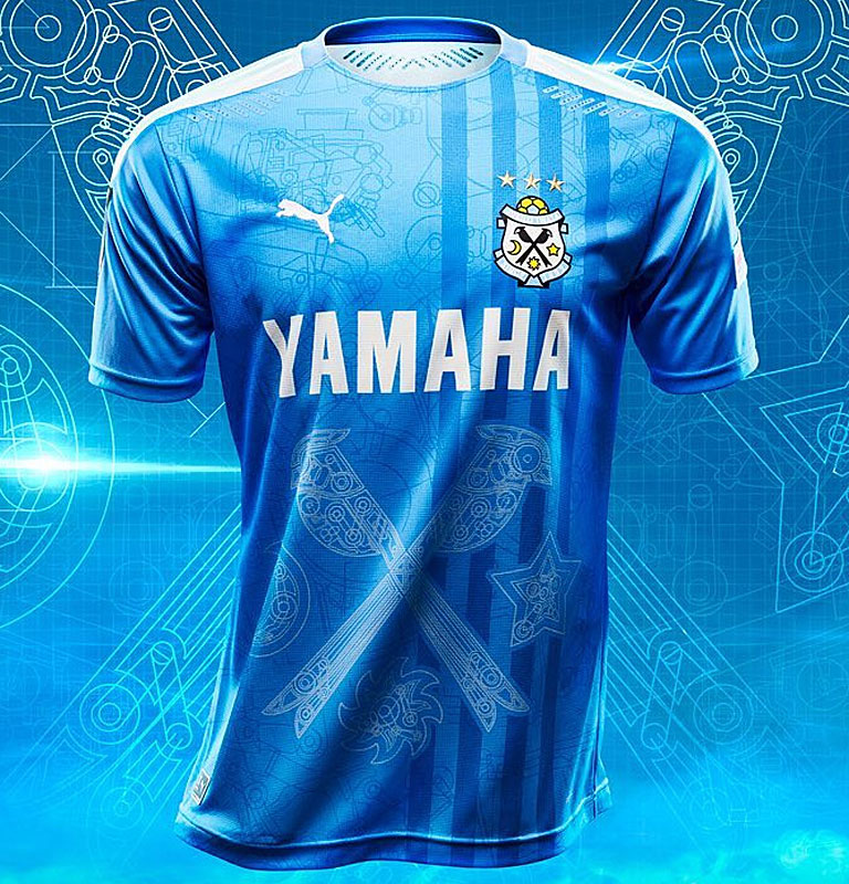 NEWホームキットのデザインは、ホームタウンである磐田市の特徴的な機械工業からインスピレーションを受けたもの。エンブレムにも使われている三光鳥を中心に、磐田市の産業を思わせるメカニカルなグラフィックを施している。