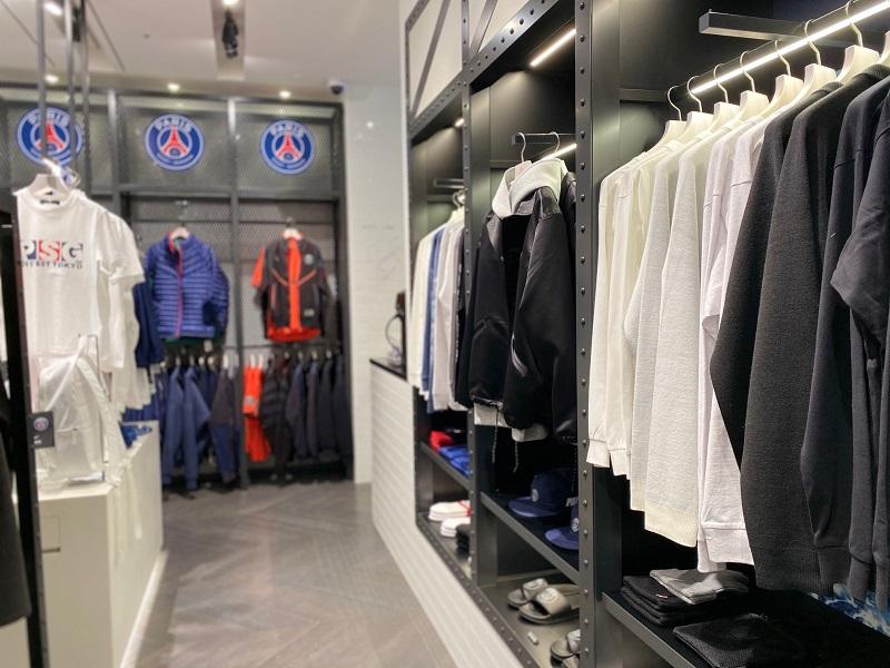 パリ・サン=ジェルマンストア シブヤ・パルコは大きく分けて3つのカテゴリーに分かれている。ユニフォームなどのサッカーアイテム、タウンユースに使いやすいライフスタイル、そして黒を基調としたアイテムが目を引くグッズである。