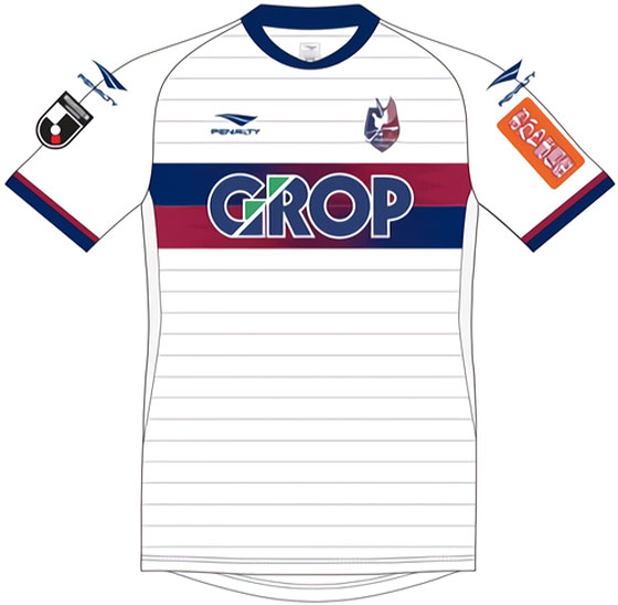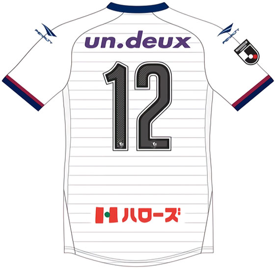 新アウェイユニフォームはホワイトをベースカラーに、グレーのピンボーダー柄というデザイン。ファジアーノレッドからネイビーに変化するグラデーションラインを胸にあしらう。
