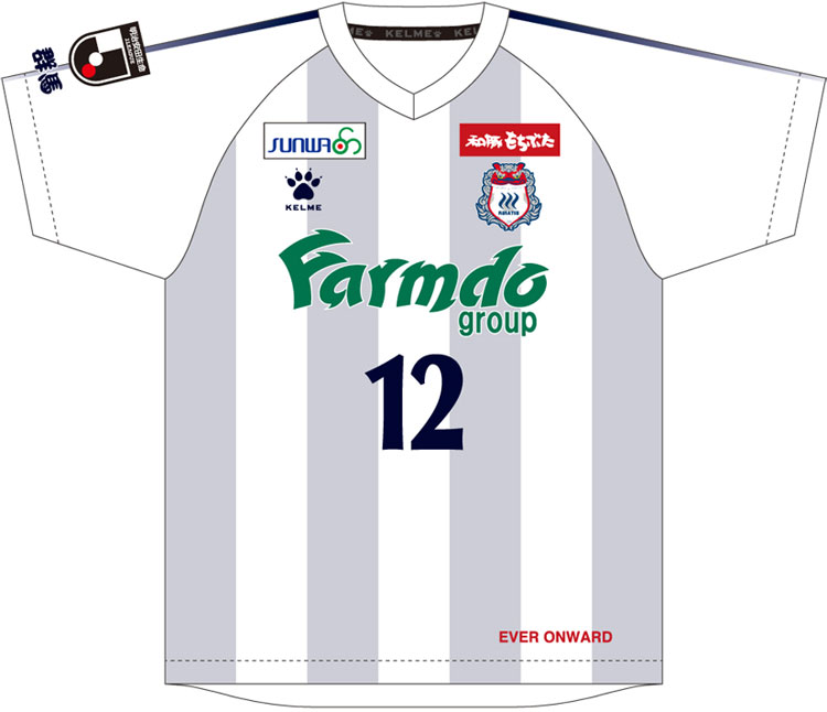 アウェイユニフォームはホワイトとグレーのストライプに。各キット共通で、シャツの左裾には継続して“EVER ONWARD(限りなき前進)”をレタリングする。