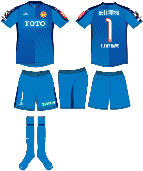 GKユニフォームは2色を展開。1stはシアンブルーからコバルトブルーに変化するライングラデーションを採用し、「スタジアムに隣接する関門海峡の青い海」をイメージ。