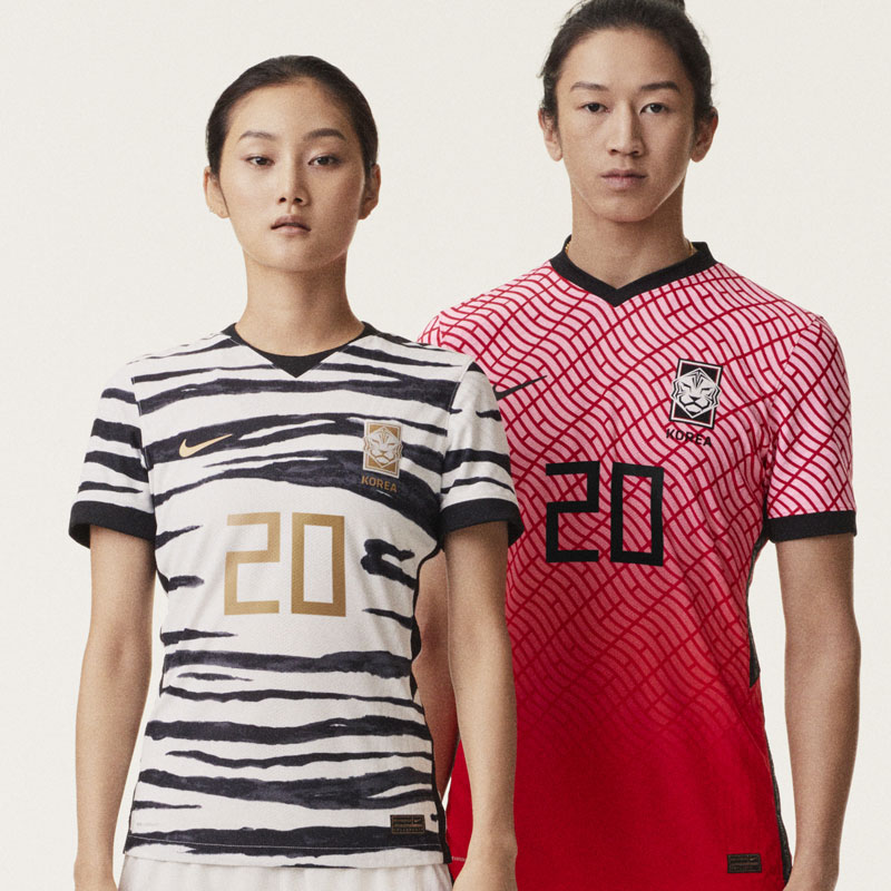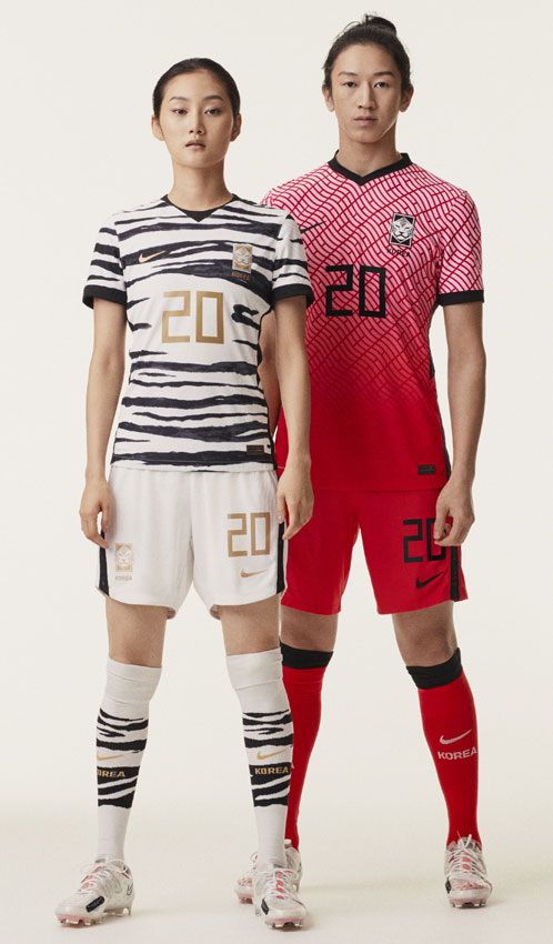 韓国代表の2020モデルはホーム、アウェイともに大胆なデザイン。レッドのホームは国旗(太極旗)にインスパイアされたウェーブ状。ホワイトを基調としたアウェイは白虎をイメージした。