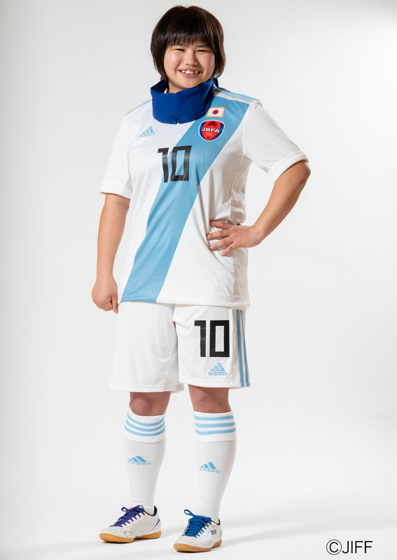 アウェイユニフォームは、ホワイトを基調にスカイブルーの襷と美しい色合いに。今回の両ユニフォームでは、ブラインドサッカー女子日本代表の菊島宙選手がモデルを務めた。