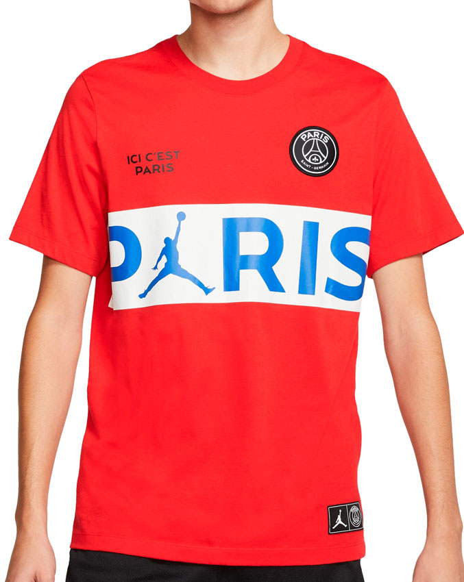 チームカラーのレッドを基調としたワードマーク(単語、あるいは文字のみで構成したデザイン)のTシャツ。右胸にはクラブのスローガン“ICI C'EST PARIS(ここがパリだ)”をプリント。