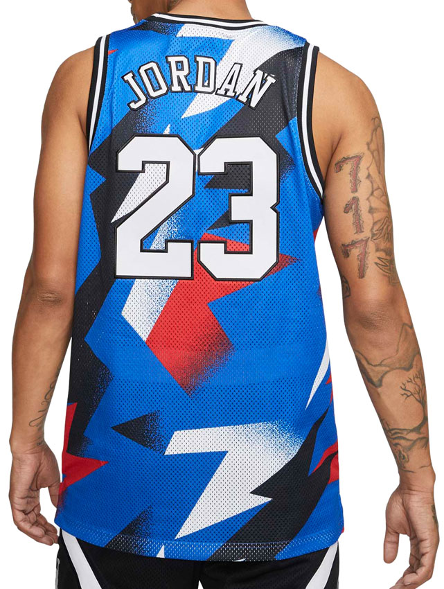バスケットボールのユニフォーム風にデザインしたメッシュシャツ。幾何学模様の大胆なデザインが目を引く。背面にはマイケル・ジョーダン氏が付けていた23番をプリントする。