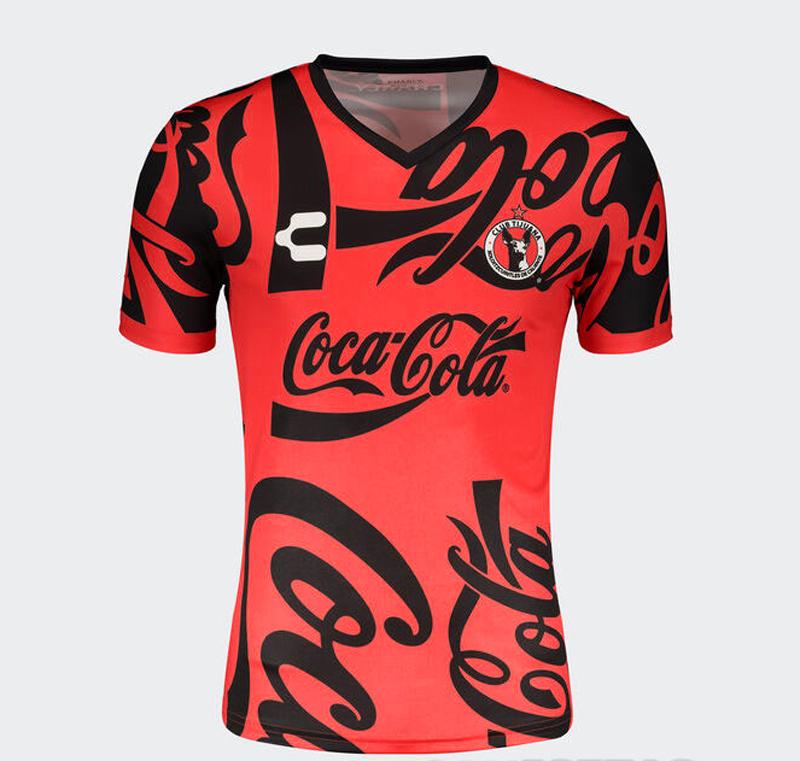 ティフアナも2種類のコラボユニフォームを発表。こちらはコカ・コーラのロゴマークを落とし込んだデザイン。ここまで大胆だと、ユニというよりも普通のTシャツに見える。