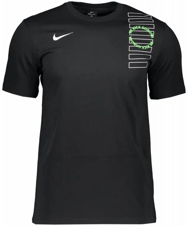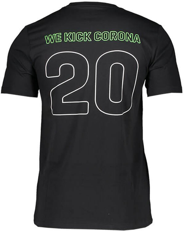 背番号20をプリントしたブラックカラーのTシャツ。左胸のワンポイント的なグラフィックと円状の“WE KICK CORONA”に目を奪われるデザインだ。