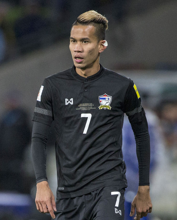 これはアウェイではなくホーム。タイといえば通常はブルーのホームキットを使うが、この時はプミポン国王の逝去に伴い、喪に服す意味でホームキットをブラックに変えている。