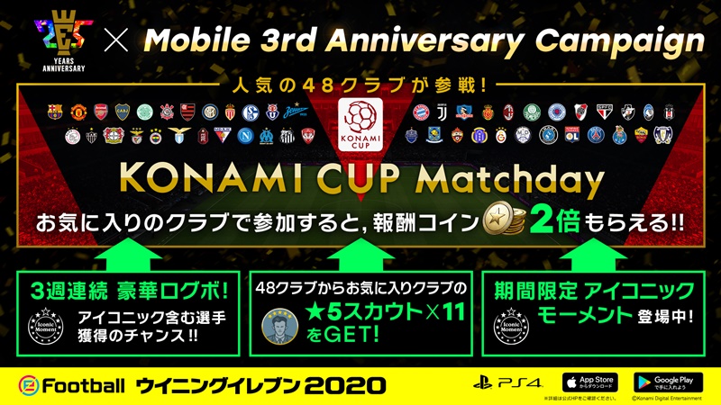 人気の48クラブが参戦するMatchdayイベント「Konami Cup Home V Away」では、開催期間中に獲得できるmyClubコインが倍増するほか、Matchday対象48クラブの「★5スカウト×11」が獲得できる選手プレゼントキャンペーンを実施。