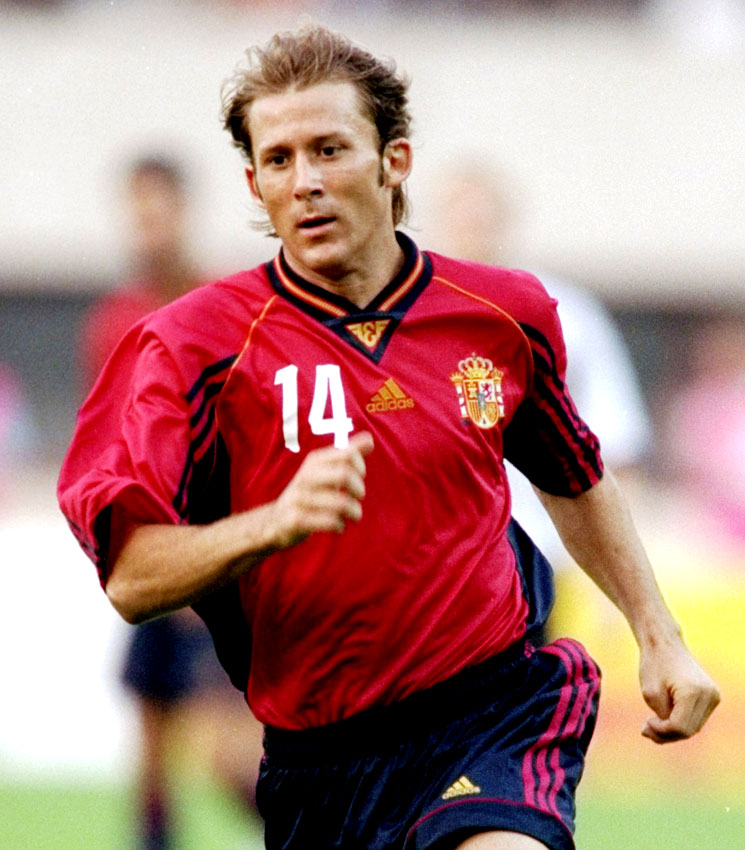98年のフランスW杯で使われたユニフォーム。シャツは全体的に赤が多めで、スリーストライプスは幾分控え目に走らせる。胸元の文字“FEF”はスペインサッカー連盟の略称。