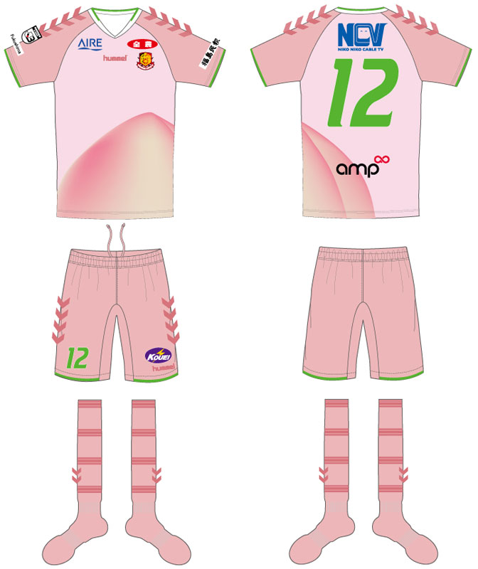 パンツとソックスも含めた完全版はこのような感じに。ユニフォームには福島ユナイテッドFC農業部パートナー6社(福島民報社、JA全農、アイレ、ニューメディア、amp、広栄電設)のパートナーロゴを掲出する。