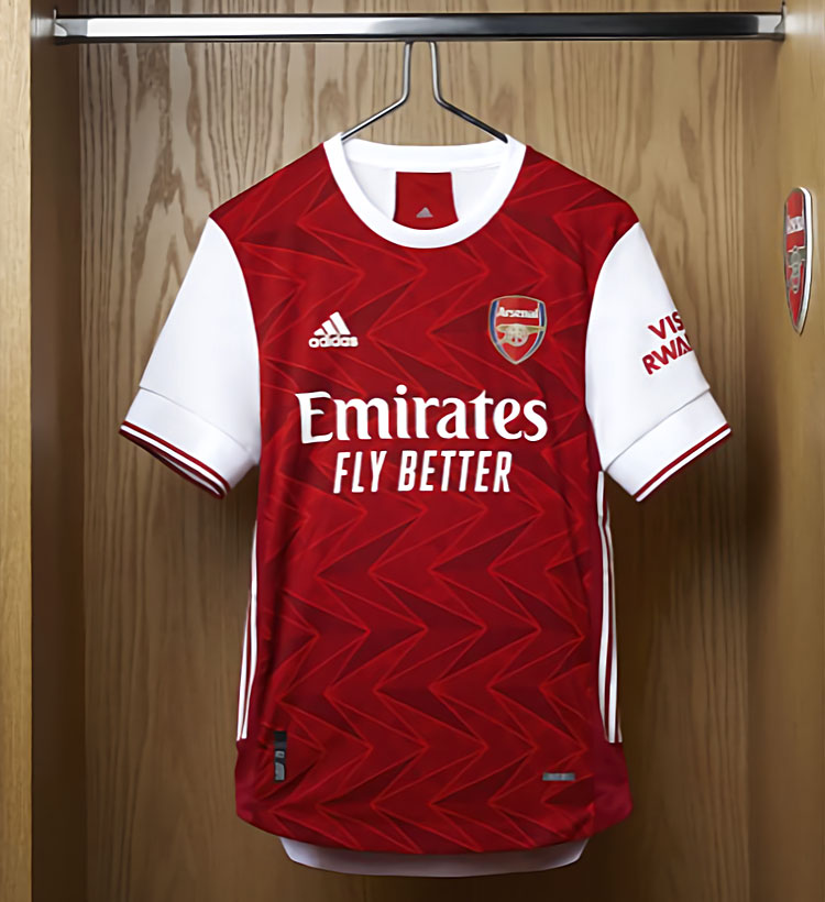 新しいホームキットは前面と背面に横向きのV字(シェブロン)をあしらったデザインに。胸スポンサーはエミレーツ航空で変わらないが、ロゴマークは「Emirates Fly Better」へ変更となった。