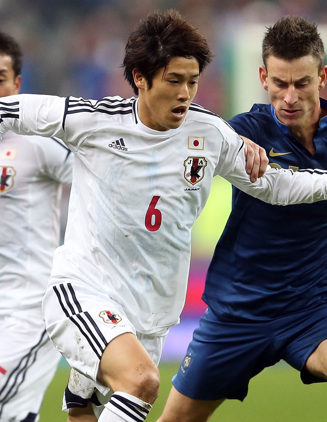 2012年10月。内田も出場したフランス代表とのアウェイゲームでお披露目となったユニフォーム。シャツには荒々しい毛筆タッチでブルーの八咫烏(ヤタガラス)を描いている。