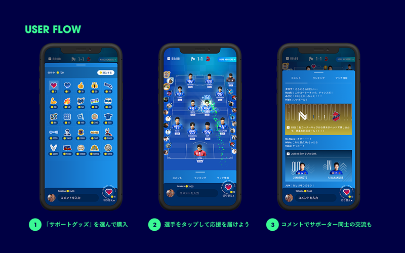 サービス内通貨である「サポート」を購入し、選手やプレーの⼀つ⼀つに対して、デジタルグッズを介した応援を届ける「サポーティング」が可能。