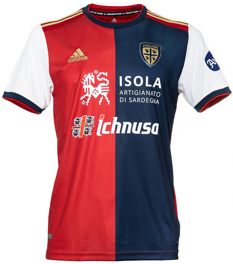 今季はadidasのキットを着用するカリアリ。右がレッドで左がブルーの半々デザインが伝統だが、袖をホワイトで彩るのはクラブ史上初となる。