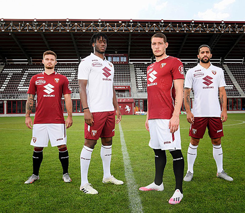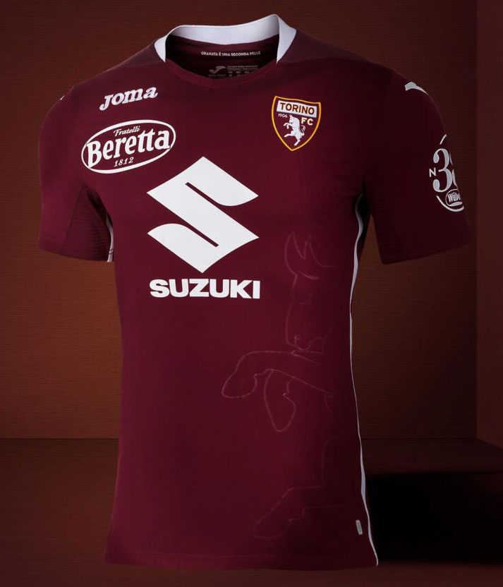 ベースカラーは伝統のグラナータ(えんじ)。左脇の大きなトーロ(雄牛)の透かしプリントが特徴的な一着だ。胸スポンサーは日本の自動車メーカー「SUZUKI(スズキ)」。