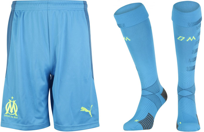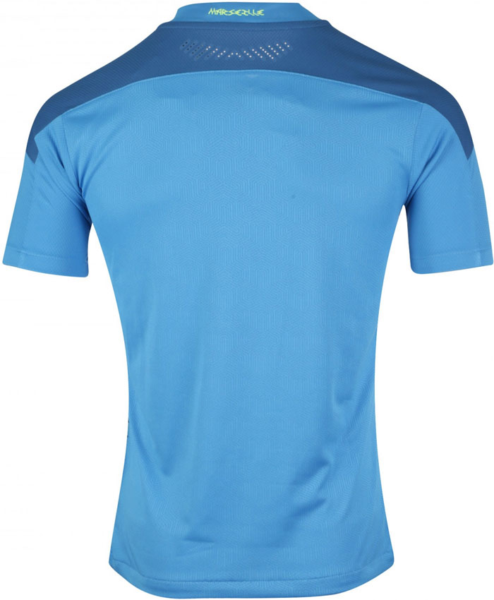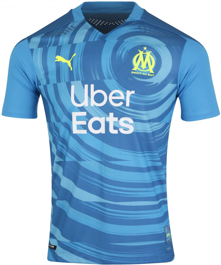 新サードユニフォームはブルーを基調に、発色の良いエレクトリックイエローを組み合せる。デザインはマルセイユの街のストリートカルチャーにインスパイアされたもので、渦を巻くようなデザインが特徴的。