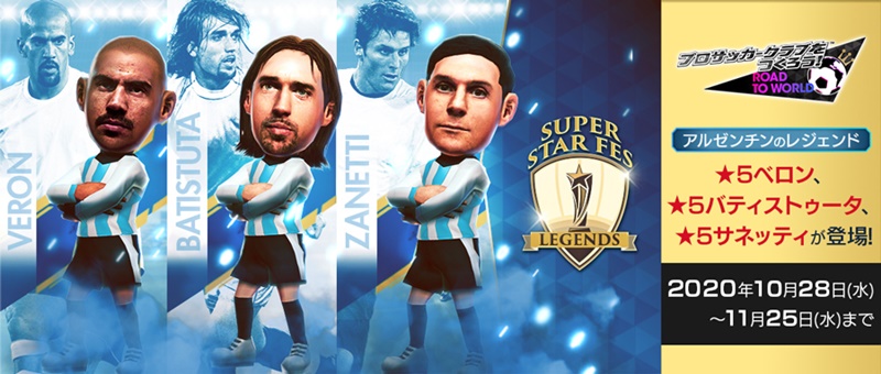 好評配信中のスポーツ育成シミュレーションゲーム『プロサッカークラブをつくろう! ロード・トゥ・ワールド』(以下 「サカつくRTW」)では、10月28日(水)より、アルゼンチンのレジェンド選手「ガブリエル・バティストゥータ」「ハビエル・サネッティ」「フアン・セバスティアン・ベロン」 が登場する“SUPER STAR FES LEGENDS”を開催します。