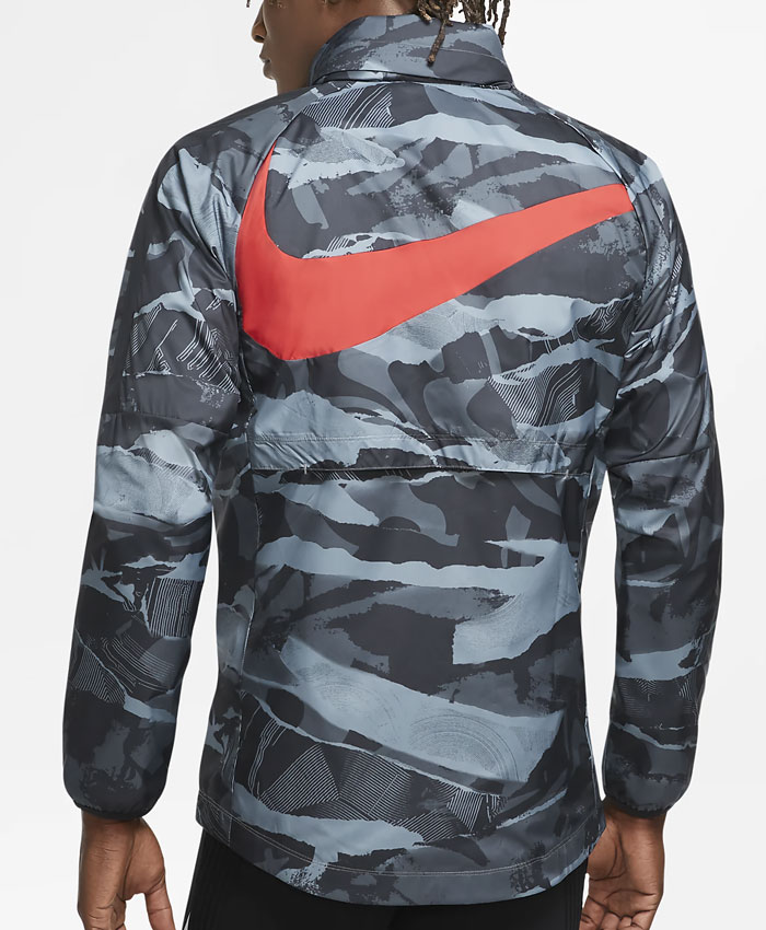 雨の日のトレーニングにも使える軽量素材の全天候対応ジャケット。カモフラージュ柄に浮かぶバックのスウッシュが目を引くデザイン。