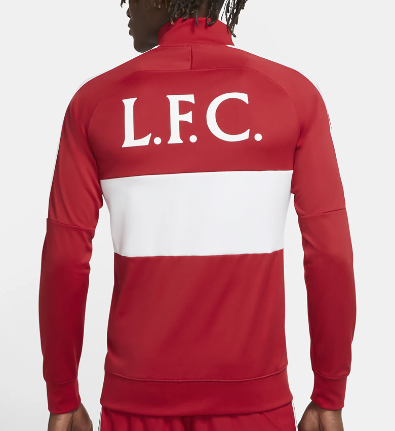 伸縮性素材を使ったトラックジャケット。チームカラーのレッド&ホワイトで彩り、バックのL.F.C.がアイコニックなデザイン。