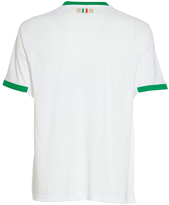 アウェイキットはホワイトを基調とし、胸の水平ストライプや襟、袖口にチームカラーのグリーンを配する。