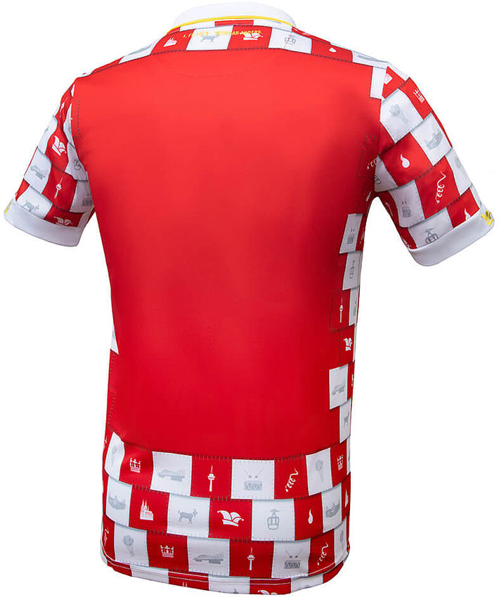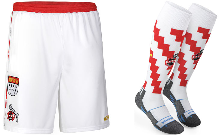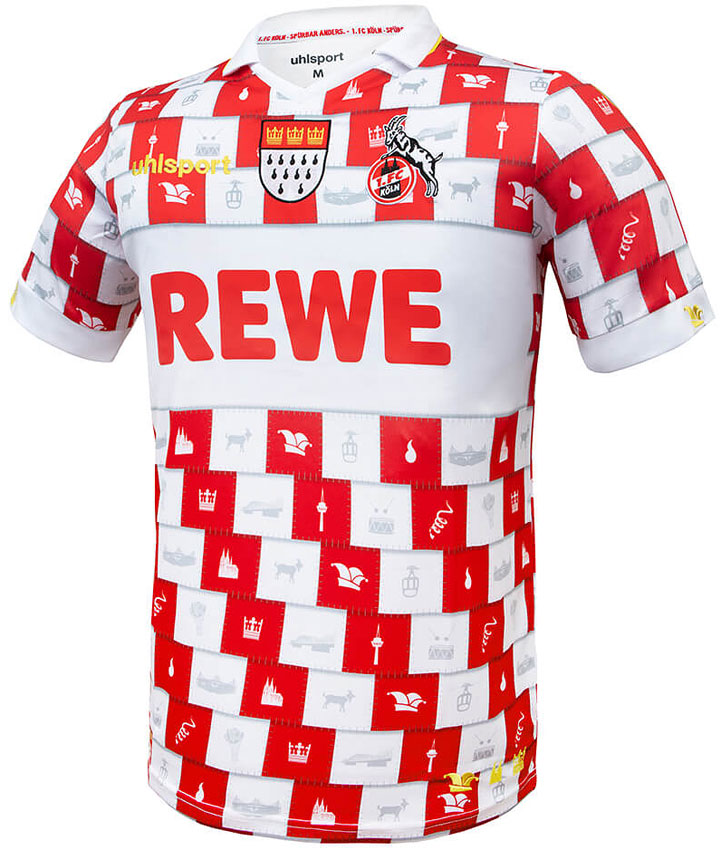 胸部中央の盾形エンブレムは、ケルン市の紋章や旗に描かれているもの。シャツ全体には、ケルン大聖堂、マスコットの山羊、ホームスタジアム、ケルン電波塔、王冠など、ケルンまたはカーニバルに関係する絵柄を散りばめる。