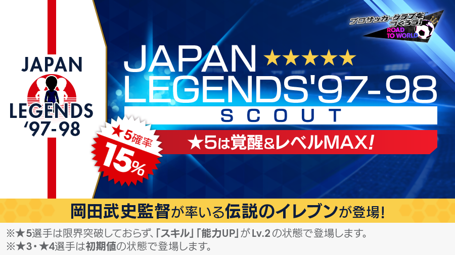 “JAPAN LEGENDS'97-98コラボキャンペーン”では、世界で活躍したJAPAN LEGENDS 11人とのコラボイベント“JAPAN LEGENDS'97-98 SCOUT”や、★4バージョンのJAPAN LEGENDS11人がもらえるスペシャルログインボーナス、JAPAN LEGENDS'97-98の11人が新★5選手としてラインナップしたミッションチケットスカウト、さらに、新★4「岡田武史」監督が手に入るコラボレジェンドマッチなどが期間限定で「サカつくRTW」に登場します