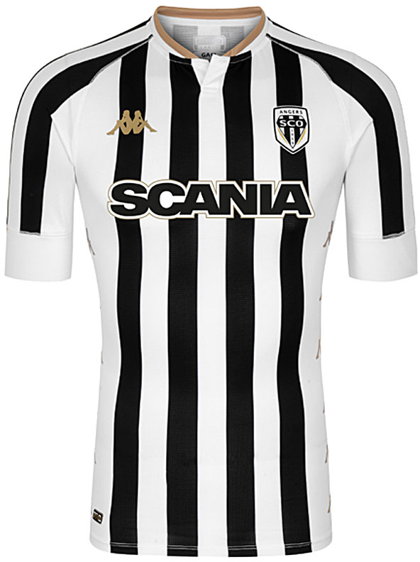 ブラック&ホワイトのストライプがお馴染みのアンジェ。今季のユニフォームも、2色の縦じまと差し色のゴールドがスタイリッシュなデザインとなっている。