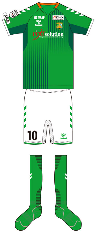 Hummel製の第一弾となる2021モデル。ホームキットはチームカラーのグリーンをベースに、県南地方の渓谷の美しさをグラデーションで表現した。