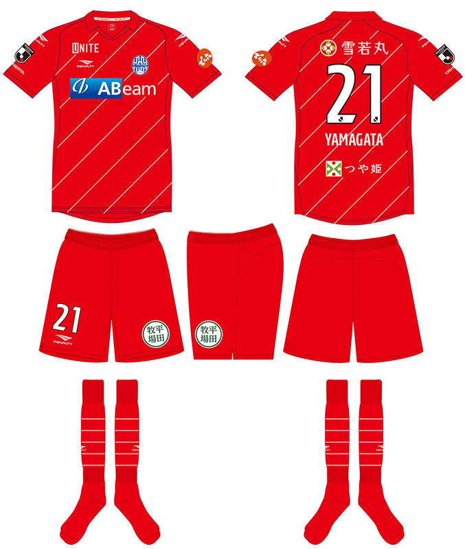 GKホームはレッドを採用。各部スポンサーは、胸が「ABeam(アビームコンサルティング)」、背中上は「雪若丸」、背中下は「つや姫」、右鎖骨は「UNITE(クリエイト礼文)」、左袖が「でん六」、パンツは「平田牧場」となる。
