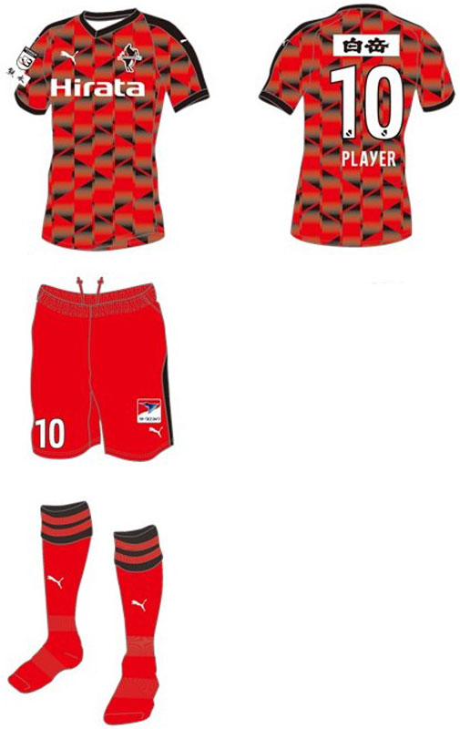 レッドとブラックの対比による陰影は「守備から攻撃への切り替えの速さ」。鋭角デザインの幾何学模様は「多彩なパス経路」と「攻撃の鋭さ」、そして「一瞬のチャンスを逃さない勝負勘」。ホームキットはロアッソ熊本の攻撃的サッカーをイメージしたデザインとなっている。