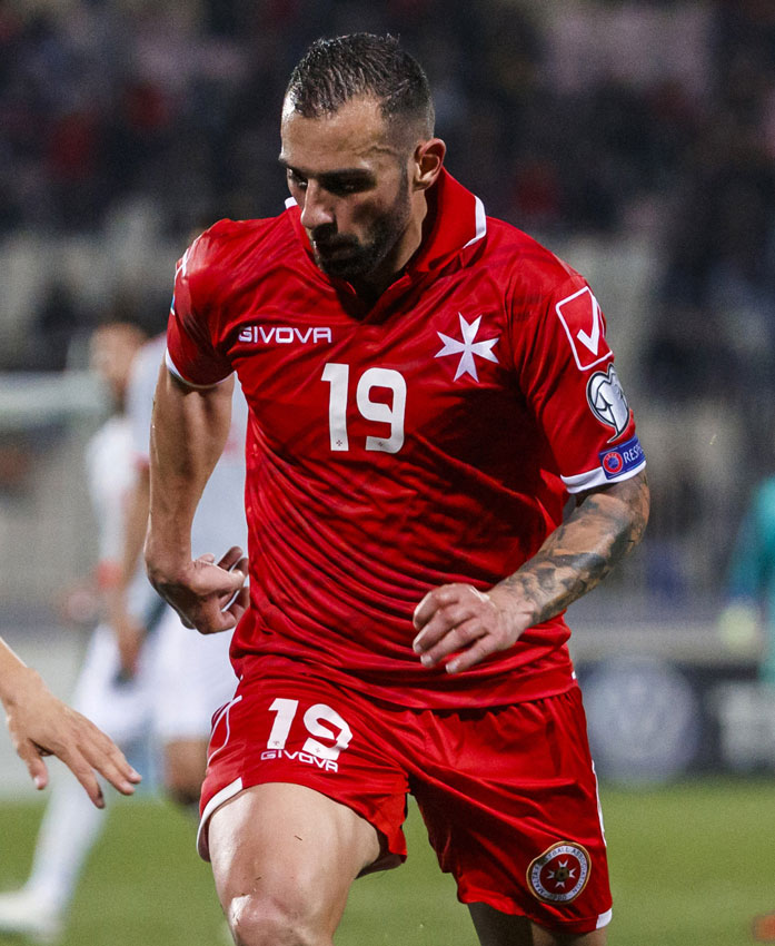 EURO2020予選などで使用した現行モデル。近年のユニフォーム左胸には、協会のエンブレムにも描かれているマルタ十字(聖ヨハネ騎士団の象徴)を付ける。