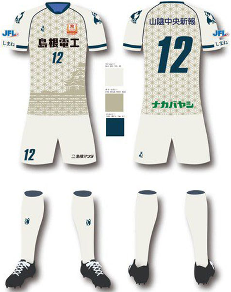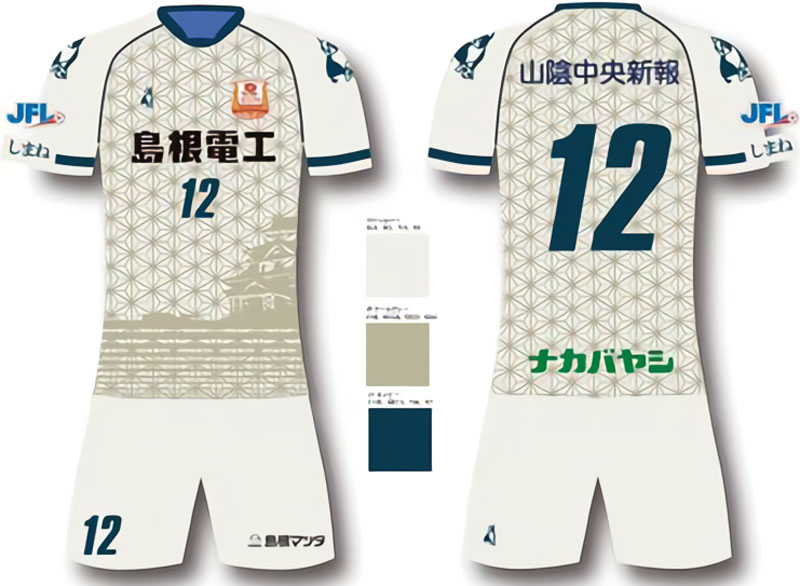 フィールドプレーヤー用は組子柄の他に、国宝「松江城」と嫁が島、宍道湖、水都松江の美しい風景をデザイン。アウェイのベースカラーには「水都松江の霞」をイメージしたシルバーを採用している。