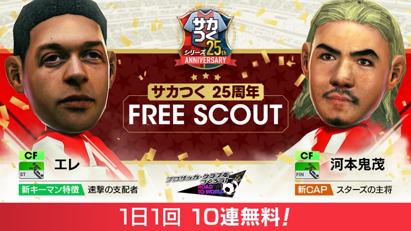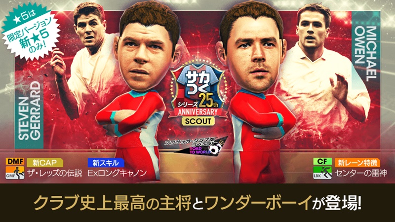 “サカつく25周年記念SCOUT”には、「スティーブン・ジェラード」や「マイケル・オーウェン」、サカつく25周年FREE SCOUT”(開催期間中、最大290連が無料!)では、「河本鬼茂」らシリーズおなじみの選手たちが新★5選手となって登場します。