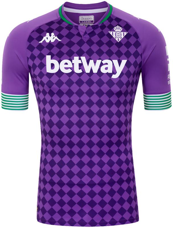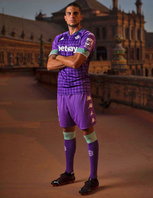 今季のベティスはアウェイユニフォームに意外性のある色とデザインを投入。緑は少なめだが初号機のようなカラーでチェッカーフラッグ柄を彩る。