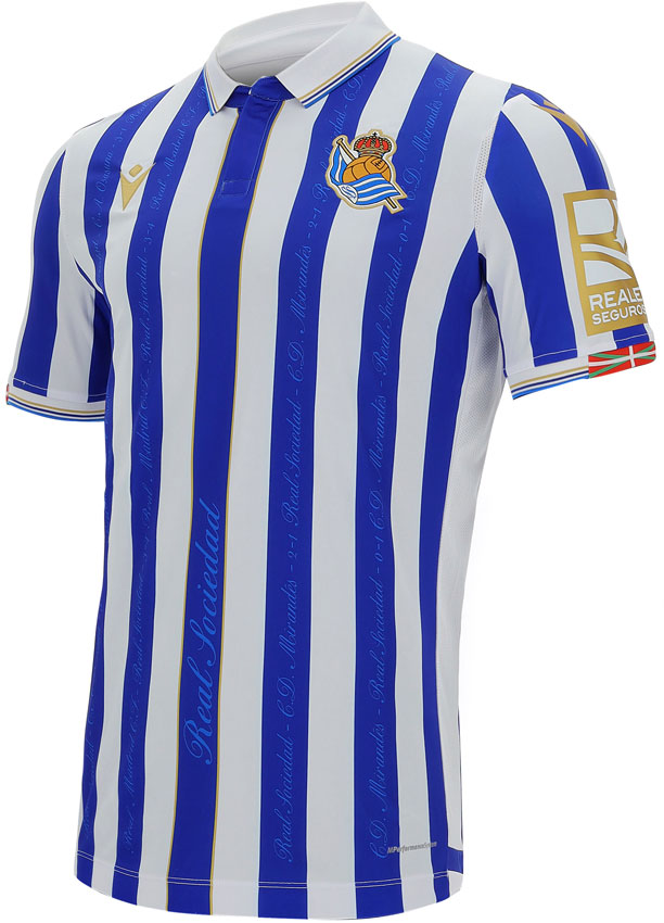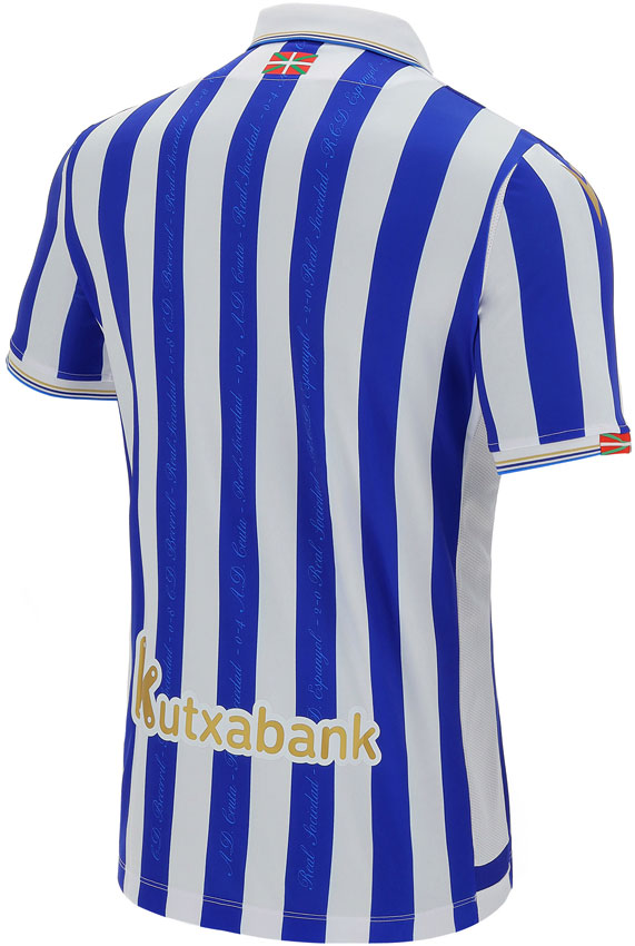 少々ややこしいのだが、これは2021年4月3日に行われる「2019-20シーズン国王杯決勝戦」の特別ユニユニフォーム。デザインはソシエダの伝統的なストライプだが、その中には決勝までの試合結果がプリントされている。