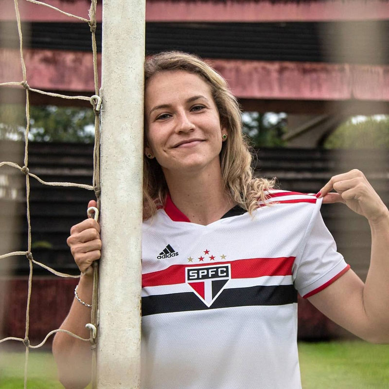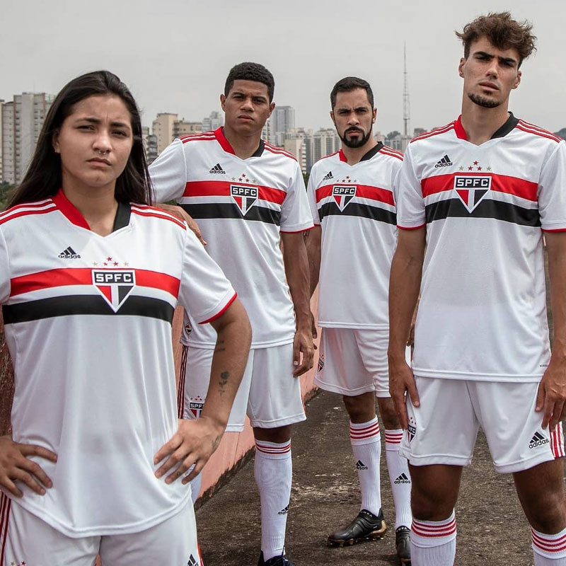 Vネックは左半分がブラックで右半分がレッドとアシンメトリーに。肩のスリーストライプスはレッドで彩る。パンツとソックスもシャツと同じホワイトを基調としたデザインで、全身をメインのホワイトでまとめている。